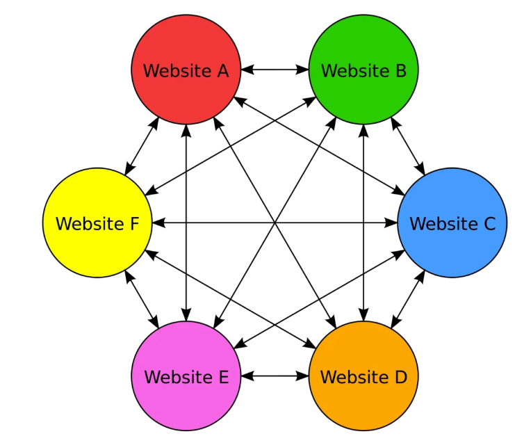 鏈接農場包括多個網站,像一個網站組,這些網站都鏈接到組中的所有其他網站,如下圖。
