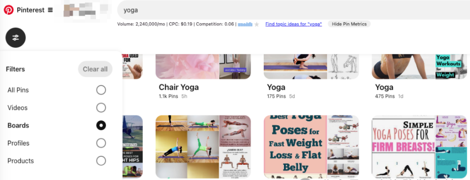 首先在搜索框中搜索關鍵詞,并通過左側的篩選功能將我們需要的信息篩選出來。此時就可以在內容去看到所有與“yoga”相關的Board(帖子合集)。