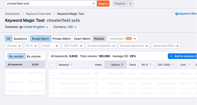 找到Keyword Magic Tool,輸入一些和你產(chǎn)品最相關(guān)的關(guān)鍵詞(產(chǎn)品名,行業(yè)名)