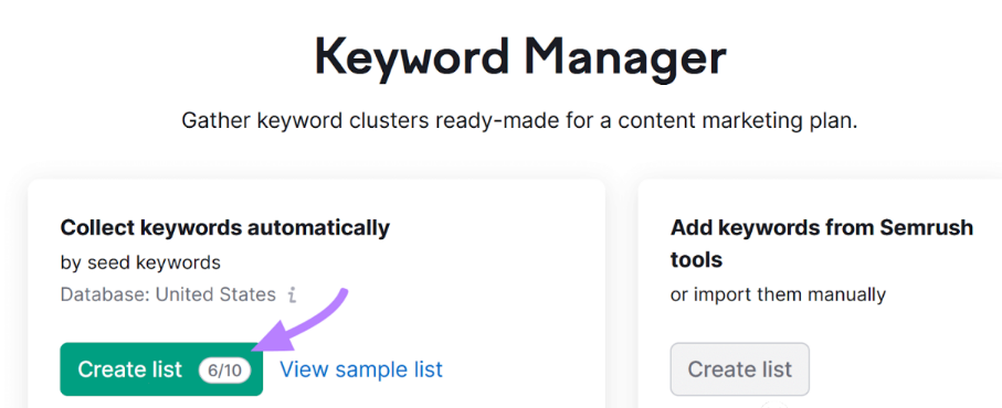 很多關(guān)鍵詞調(diào)研工具和AI寫作工具都可以幫你整理關(guān)鍵詞主題地圖,像SEMrush中的Keyword Manager。