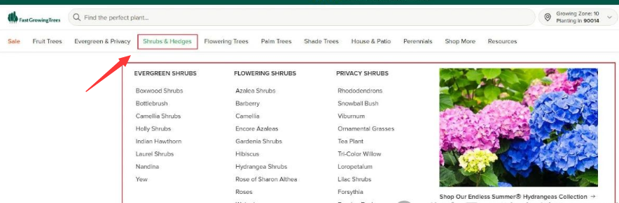 用一個大的mega菜單,將樹木商品的類別按種類,種植地點,種植季節,種植目的(水果,護院,美觀)等分類列出,方便用戶引導購買。