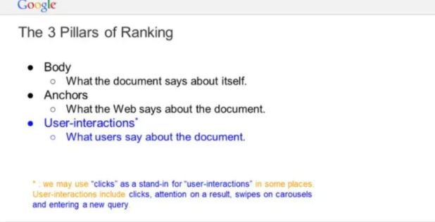 當然,這些也不是站點被打擊的唯一原因,只是能側面反映出用戶行為被谷歌的重視程度,實際上無論是之前谷歌泄露的文檔,還是各大SEO媒體調研出來的數據,都顯示出用戶行為(停留,點擊,跳轉,互動等)與頁面排名的正向關系。