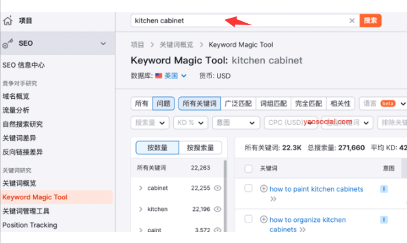 競爭對手的網站的會找吧,找到幾十個后繼續使用Semrush工具,使用自然搜索研究功能。