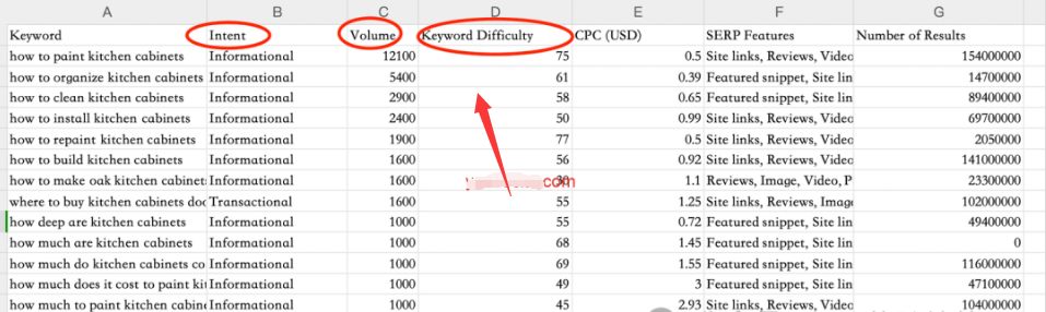 但是對我們最有價值的信息只有intent,search difficulty和volume。你可以現在就對合并后的表進行處理,并且只保留關鍵詞、搜索量、搜索難度和搜索意圖這4列。我們將此表叫做表A。