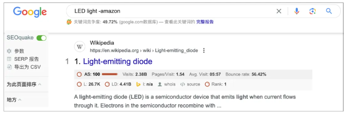 這個技巧常被用于外貿(mào)開發(fā)客戶,通過在關(guān)鍵詞前面加個減號-,排除該關(guān)鍵詞相關(guān)的結(jié)果。比如,我們想要查找LED燈的供應(yīng)商,但不想看到來自亞馬遜的結(jié)果。輸入搜索指令:LED light -amazon