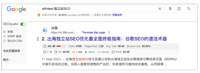使用谷歌的“allintext:”搜索語法,可以幫助我們搜索正文中包含完整關(guān)鍵詞的網(wǎng)頁。如果去掉all只使用“intext:”,那么搜索來源將不限于頁面正文部分,其標(biāo)題、url鏈接等部分也會成為關(guān)鍵詞來源。比如,我們想要查找正文中含有獨立站SEO這個關(guān)鍵詞的頁面。輸入搜索指令:allintext:獨立站SEO