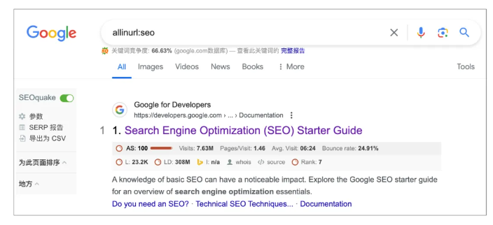 使用鏈接查詢語法“allinurl:”能夠幫助我們查找到url鏈接中包含目標(biāo)關(guān)鍵詞的頁面。比如,我們想要查找url鏈接里包含“seo”的頁面。輸入搜索指令:allinurl:seo