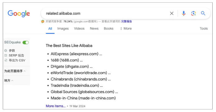 這個指令是用來搜索類似網(wǎng)站的,比如你搜索個related:alibaba.com,谷歌會給你推薦類似的電商平臺。有些人會覺得,這個沒啥用呀。你想想,你知道客戶的網(wǎng)站是www.xxx.com,那你想找跟客戶類似的一些網(wǎng)站,這個時候就可以用related指令了。