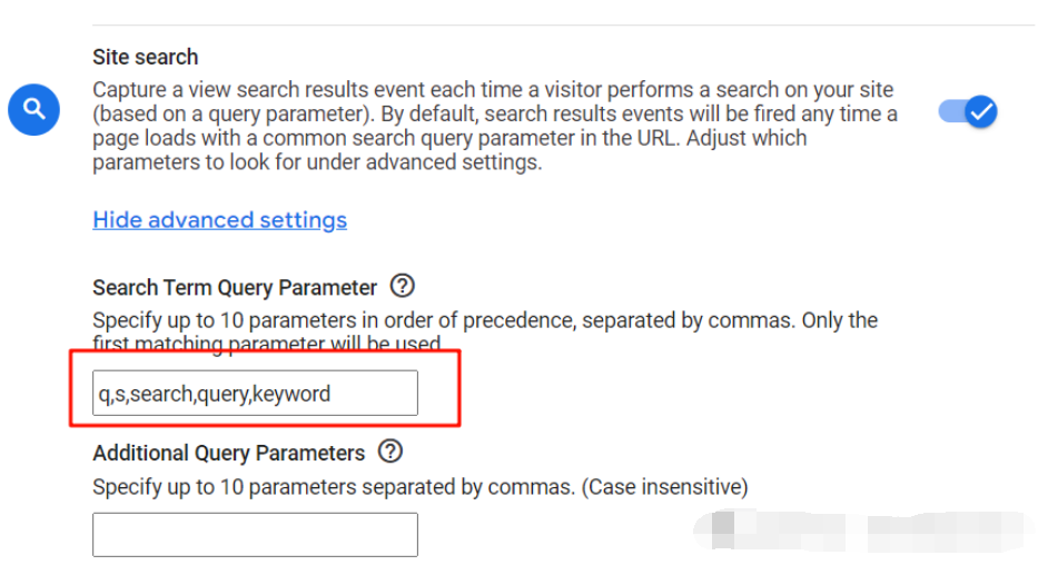 GA4后臺,通過路徑:Admin>> Data collection and modification>> Data collection and modification >>Enhanced measurement >>Configure enhanced measurement>>Site search>>Show advanced settings