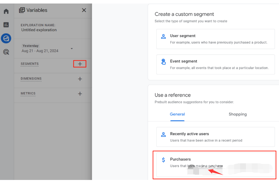 2. 點擊“ SEGMENTS”旁邊的 +,選擇“Purchasers”,然后點擊“Save and apply”。