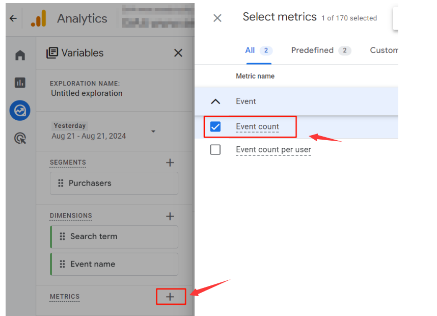 4. 點擊“ METRICS”旁邊的 +,勾選“Event count”,然后點擊“Import”。