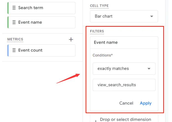 7.點擊 "FILTERS",點擊“Event name“, 完全匹配選擇 “view_search_results“