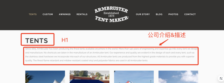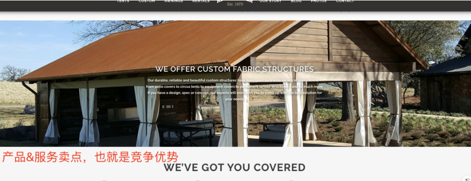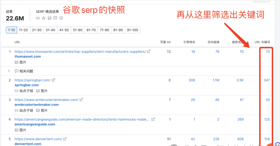因為這些頁面被谷歌判定是和【usa tent manufacturers】有關系的,而【usa tent manufacturers】只是這些頁面的一個關鍵詞入口。我們再從快照里的serp競對站頁面,挖掘出他們有哪些關鍵詞是可以和我們的廣告頁面相匹配的,也是可以滿足用戶意圖,并且到達對應的頁面。這是不是又可以擴充我們這個廣告登錄頁面的有效投放關鍵詞數量。如圖: