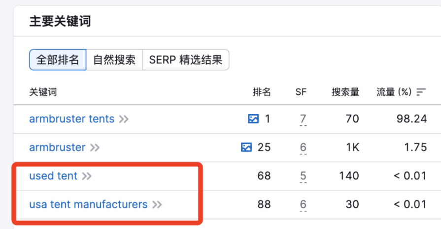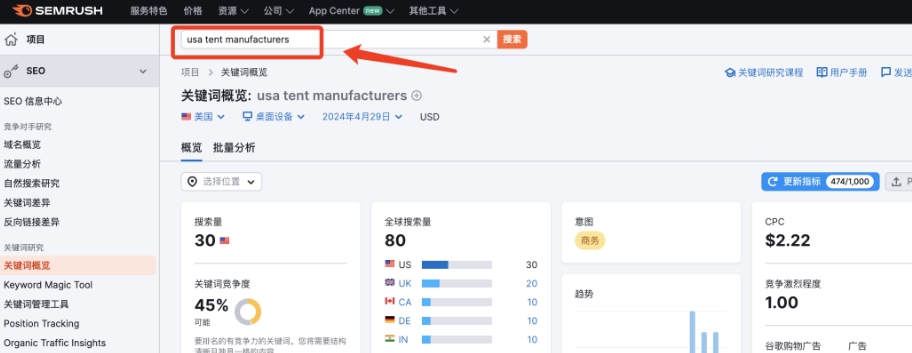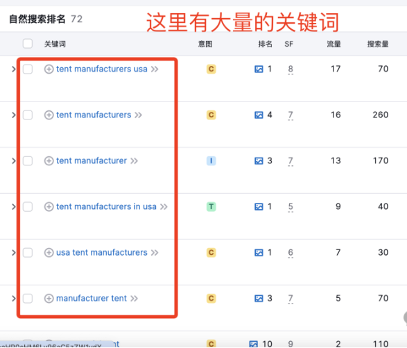 剔除前兩個品牌詞,還有兩個產品詞,但是二手的就不考慮了。我們把【usa tent manufacturers】單獨拿出來,進行廣告頭精準投放。但是這樣詞還不夠,對不對?我們拿去semrush進行關鍵詞搜索。如圖: