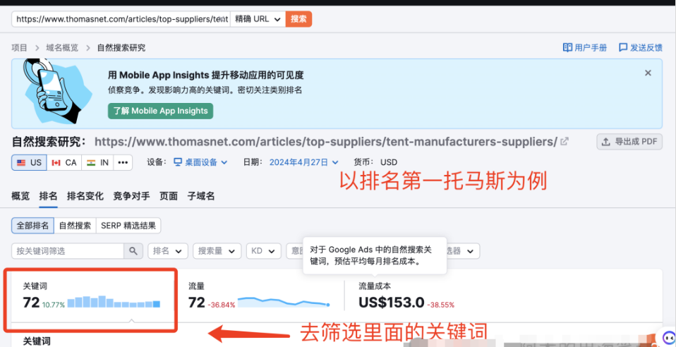 接下來,我們將這些頁面放入Google搜索,分析它們是通過哪些關鍵詞獲得流量的。這一步可以幫助我們了解關鍵詞的排名和搜索量,從而篩選出有轉化潛力的關鍵詞。