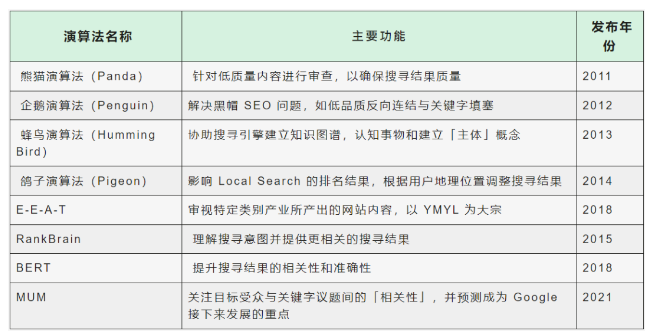 Google搜索引擎的演算法歷史中有多個重要的更新,以下是一些主要的演算法與其年份