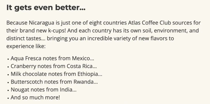 Atlas Coffee Club(寰圖咖啡)是一個美國著名的咖啡訂閱服務平臺,專注于為客戶帶來全球各地的咖啡風味。據說每一批咖啡豆都經過精心挑選,來自不同國家,確保顧客在家中就能享受到世界各地的獨特口味。而且,號稱他們的咖啡豆都是新鮮烘焙的,保證每一口都充滿新鮮的香氣和口感。
