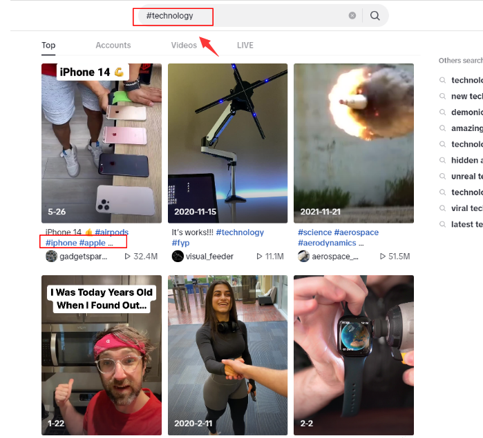 1)直接搜索行業關鍵詞或標簽(hashtag#),就會出來很多視頻,可以通過視頻找到對應的網紅進行篩選聯系。
