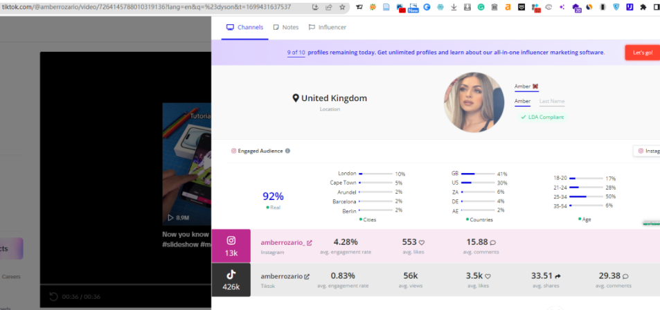 安裝這個插件后,點擊紅人的任何一個視頻,插件就會自動顯示紅人的信息,幫助我們判定。但這么好用的工具肯定是要錢的。免費版每天可以查看10個。