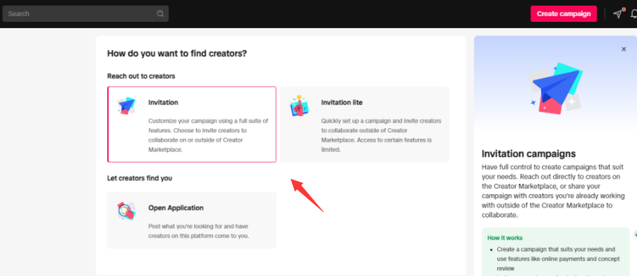 這個是TikTok官方開發的工具,免費給企業使用,付款走線上線下都行。注冊時需要提供相應的公司信息證明,登錄以后可以無限制地尋找紅人。主要流程是發起Campaign,填寫項目信息,給合適的紅人發出邀請。
