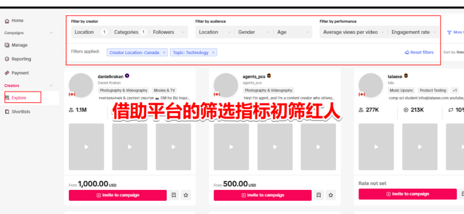 一個Campaign最多可邀請40個紅人,但Campaign數量不限。只要紅人在創作者市場注冊過,就能搜到,還可以看到其賬號的相關數據。