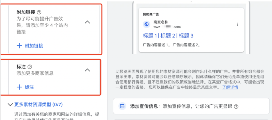 如果賬戶層級有添加,可以直接選取。盡可能多的添加附加鏈接,增加曝光。如圖: