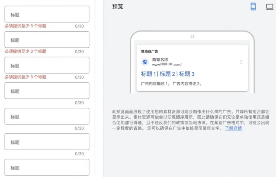 提供盡可能多的廣告標題,讓谷歌去自動適配匹配的人群。得到最優的廣告文案。理論上15個標題,都可以填上去,這樣子可以匹配的結果更多。如圖: