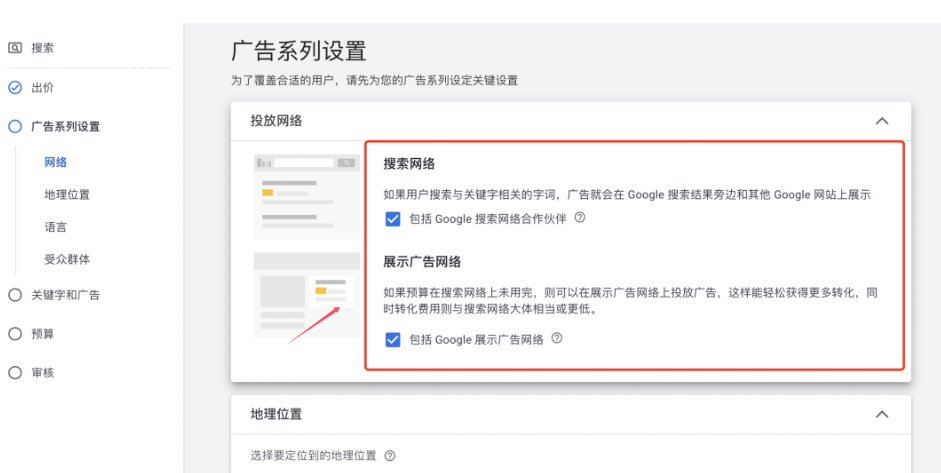 這里指的搜索網絡和展示廣告網絡,是和谷歌合作Google adsense的網站。相關度不高,在預算有限的情況下,不建議勾選。