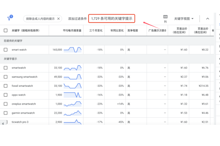 將這1729個關鍵詞導出,然后根據網站的產品類目做區分。目前看到這里面的關鍵詞有很多是其他品牌的詞。需要單獨整理出來。這個是根據行業大詞相關的關鍵詞。如圖: