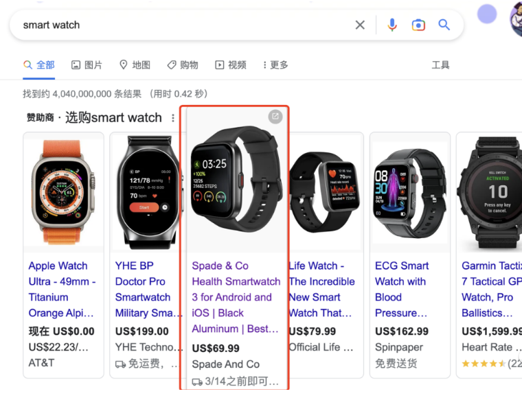 Google SEO以smart watch為例:無痕搜索,定位美國,查看有哪些商家在做廣告投放。