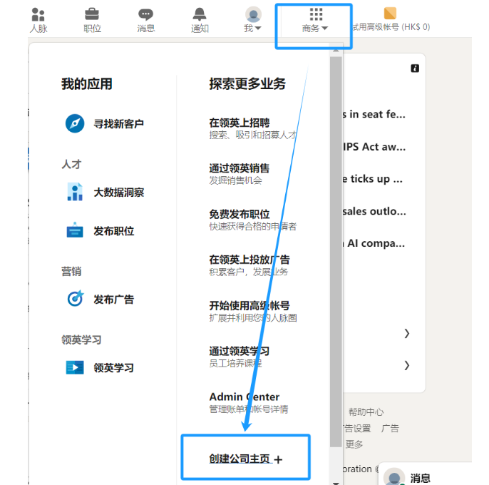 1.進入個人賬戶:登錄你的LinkedIn個人賬號,點擊右上角“商務”,選擇“創建公司主頁”。如圖: