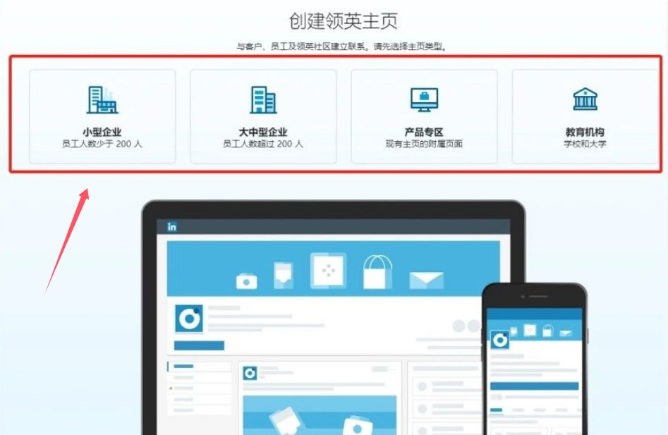 選擇適合的公司主頁類型,如公司、展示專區或教育機構。如圖: