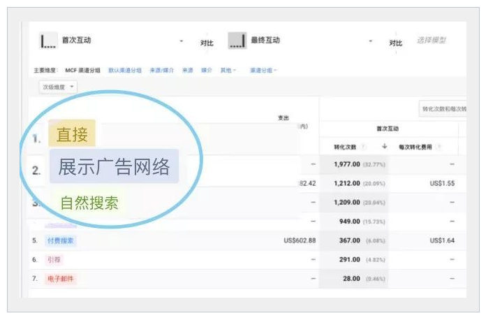 比如下方示例賬戶中,首次互動量最大的廣告渠道是“展示廣告網絡”,最終互動渠道也是“展示廣告網絡”。從這兩項數據中,可以看出客戶瀏覽其他網站看到你的圖片或視頻,更容易刺激到他們的購買欲望。如圖: