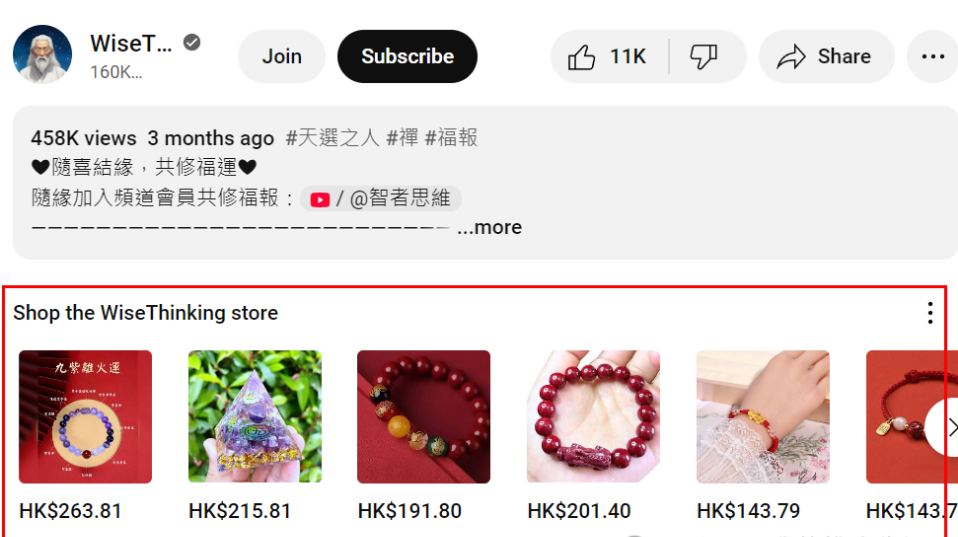 可以看到這個頻道是開通了youtube shop的,然后每個視頻的下方都會出現產品列表(不同網絡環境可能會不顯示),這個引流效果可比描述里面放一個網站鏈接好很多,如圖: