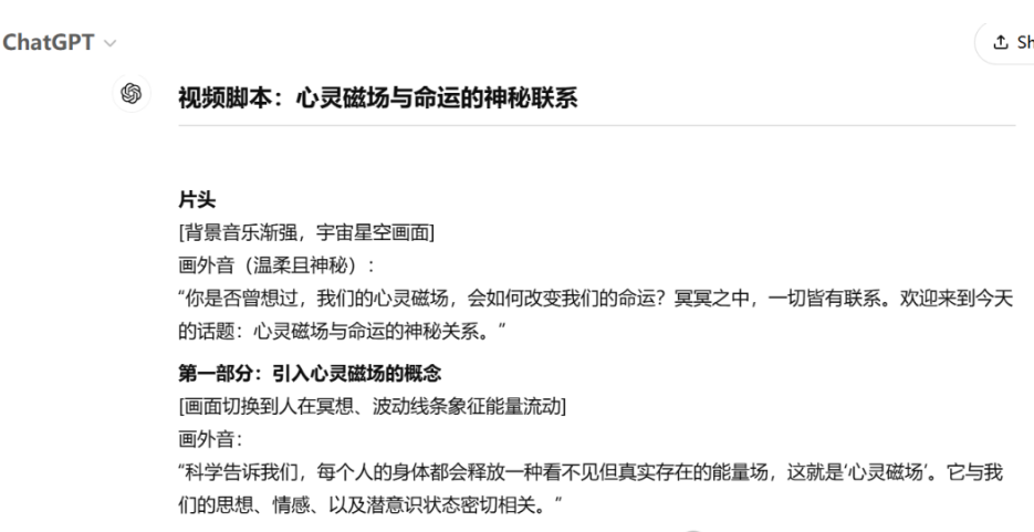 有了視頻內容大綱后,我們可以利用ChatGPT生成詳細的視頻腳本。將之前提取的文本內容大綱粘貼到ChatGPT中,并給出具體的指令,例如:“請根據以上大綱,創作一篇關于心靈磁場與命運關系的視頻腳本,字數約1500字”。如圖: