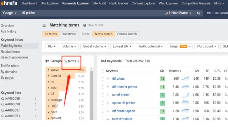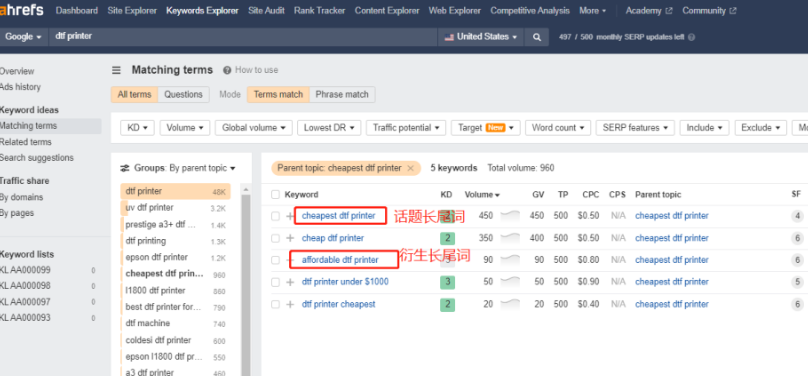 詞根(terms/head):有意義的單個的詞,for,the,這種就不屬于。比如DTF printer的DTF和Printer都是詞根。Ahrefs和Semrush等工具都有分詞根的功能: