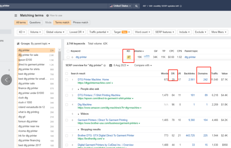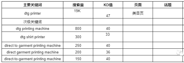比如下面這個dtg printer和direct to garment printer,前者只是后者的縮寫,含義一樣,卻是兩個parent topic。dtg printer的KD值為48更高,而direct to garment printer的KD值為37,更低。