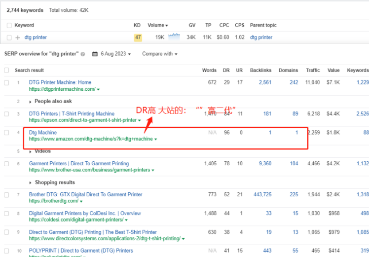 比如剛才的例子Dtg printer這個詞,排名第三的是亞馬遜的頁面,標題都沒有完全匹配,引薦域名只有一條。