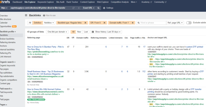 比如最開始Dtf printer排名第一頁面的引薦域名有57個,篩選一下就是43個了。而43個中page Traffic有數據的頁面也才2個。