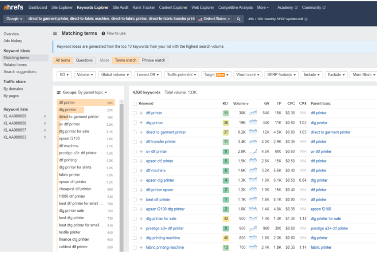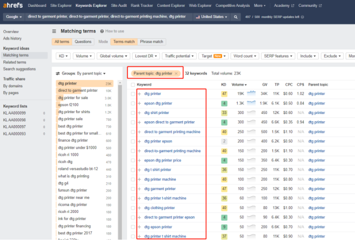 比如你是做Dtg printer的,可以借助parent topic給拓出來的詞分組,點擊parent topic,里面是一組他的次級關鍵詞,這樣很多詞都可以放在一個頁面。比如這里的dtg shirt printer,direct to garment printing machine,dtg printer machine等完全可以放在以DTG printer為主要關鍵詞的頁面里面。