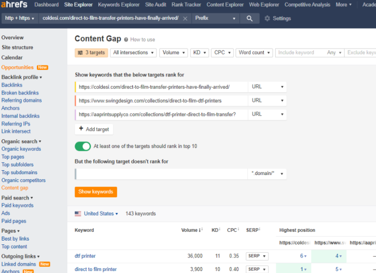 如果想幾個競對網站一起看,可以使用“Content Gap”功能。如果自己網站還沒建好,這里的But the following target doesn't rank for可以留空的。
