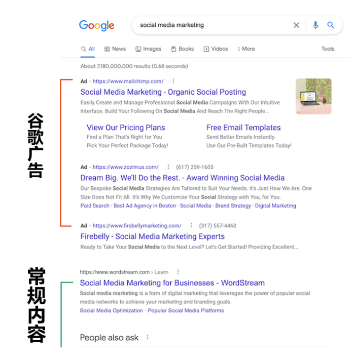 搜索廣告是谷歌廣告中最常見的類型,也是最有效的廣告類型之一。如圖: