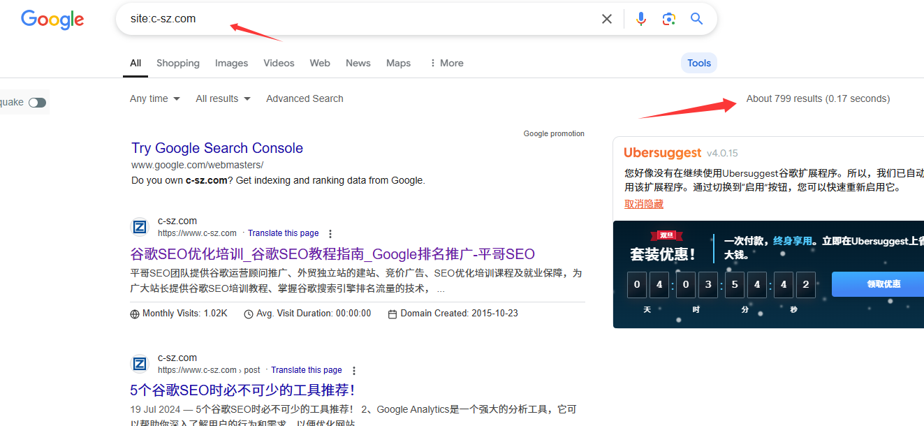 這里我們看到c-sz.com有大約799個已經(jīng)索引的URL,通過這個功能我們知道Google現(xiàn)在存儲了多少網(wǎng)頁。