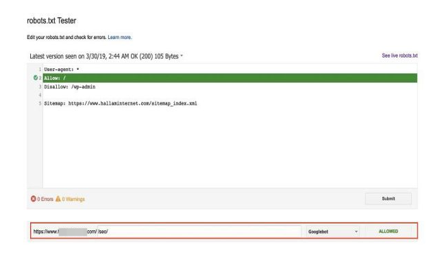 因為robots.txt是爬蟲在抓取網(wǎng)站時看到的第一個文件,所以最好是將robots.txt指向站點地圖。可以在舊版的Google Search Console中編輯和測試robots.txt文件。如圖: