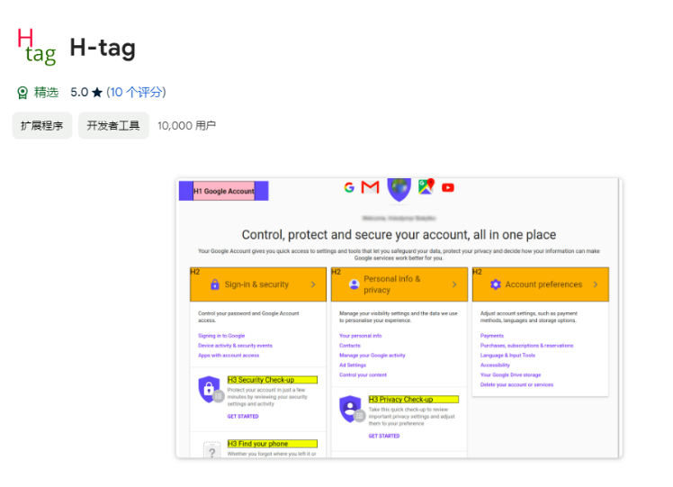 我們可以在谷歌插件商城中,安裝H-Tag擴展程序。安裝完成后我們只需要打開我們需要查找的網頁,然后打開安裝的插件,它會自動展現出來非常方便。如圖: