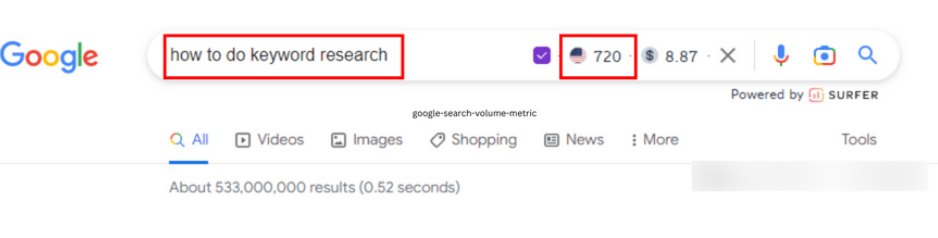 在Google中輸入您的第一個(gè)關(guān)鍵字,擴(kuò)展程序就會(huì)自動(dòng)在Google搜索欄旁邊報(bào)告搜索量。如圖: