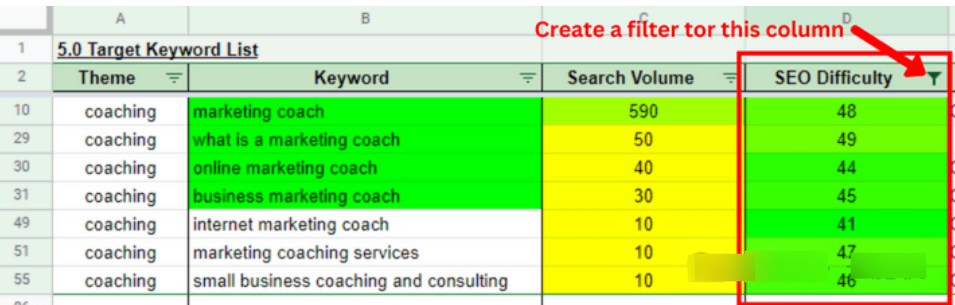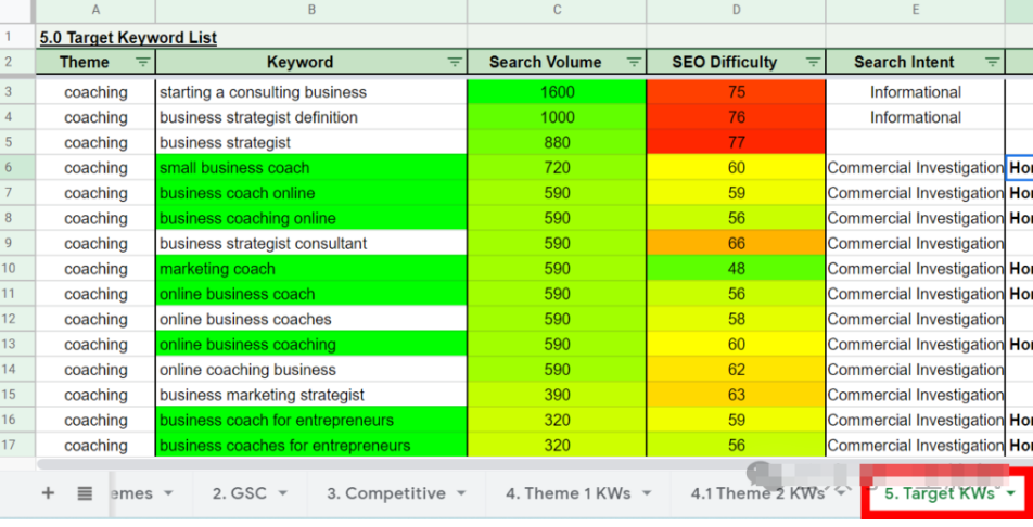 如果您使用的是平哥SEO的關(guān)鍵字研究模板,難度列將以顏色編碼。您應(yīng)該優(yōu)先考慮以綠色突出顯示的難度較低的關(guān)鍵字。