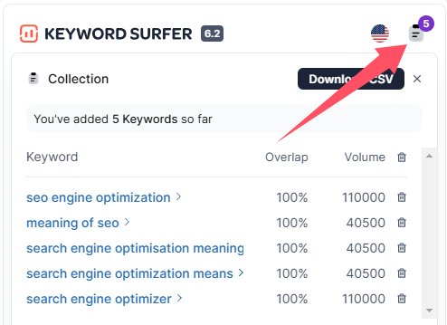 在激活該工具的情況下,將關(guān)鍵字輸入Google后,點(diǎn)擊星形圖標(biāo)將每個(gè)關(guān)鍵字保存到工具剪貼板。完成后,您可以導(dǎo)出關(guān)鍵字列表以及搜索量指標(biāo)。只需使用該工具中的下載CSV按鈕即可。如圖: