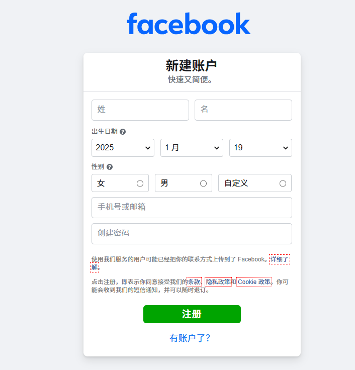 以Facebook網頁版為例,按照提示,點擊綠色的“創建賬戶”填寫相關信息。如圖: