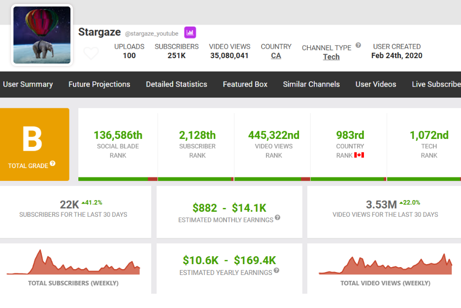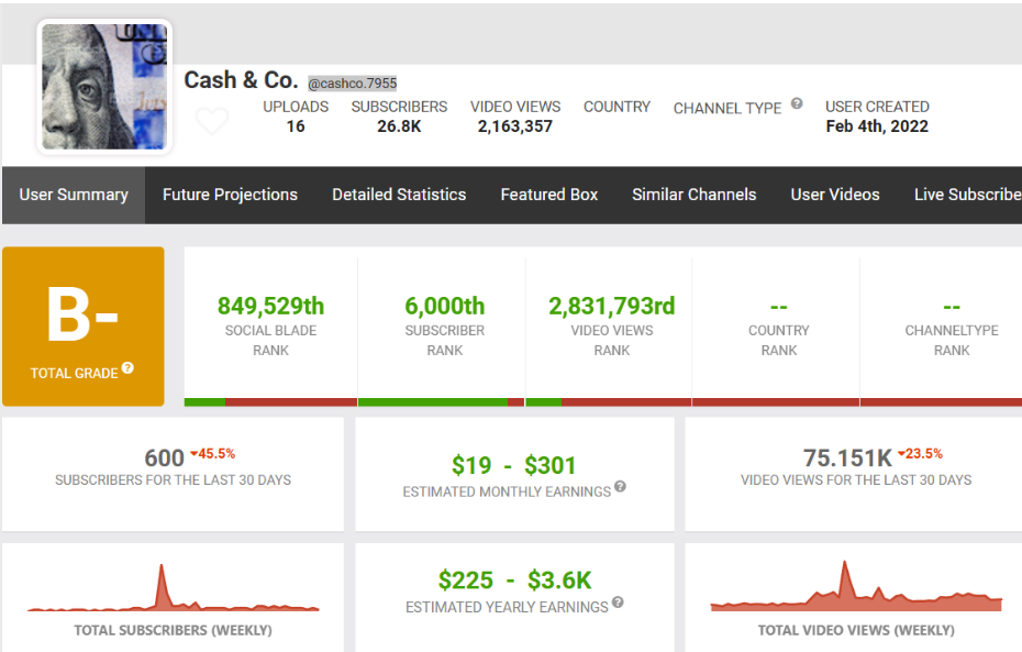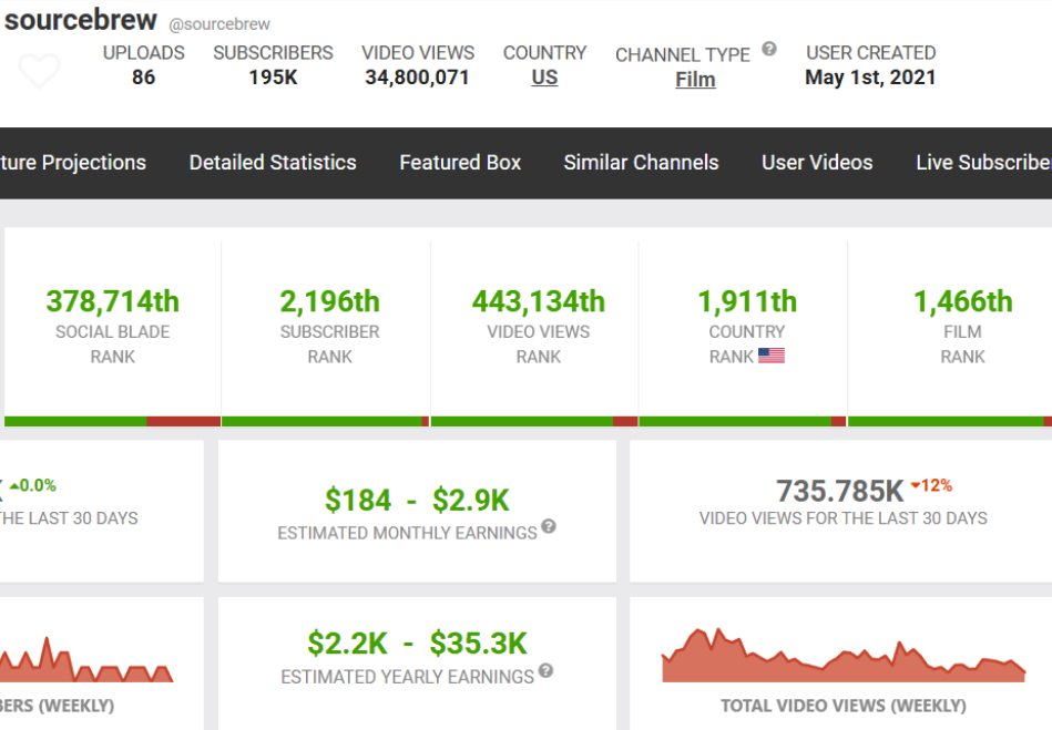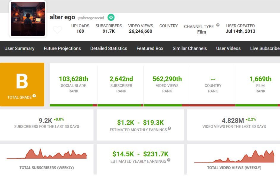 做油管為的是賺錢,所以在找對標賬號的時候也要關注一下賬號的收益情況,如何查詢收益可以用到這個工具SOCIAL BLADE.如圖: